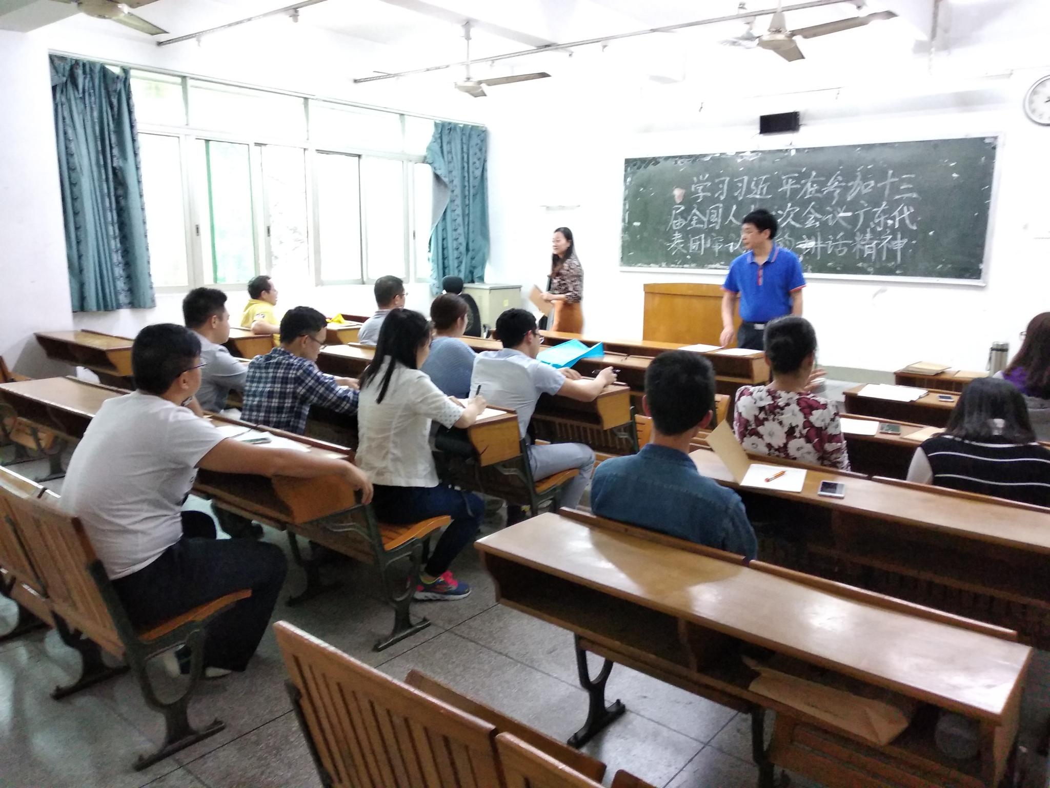 3月28日下午和3月29日下午,yl6809永利官网集团党总支分别在白云校区刘宇新楼325会议室和海珠校区教学楼202组织党总支委员和全体教工党员集中学习习近平总书记在参加十三届全国人大一次会议广东代表团审议时的重要讲话精神。会议由学院党总支欧坚泉书记主持。