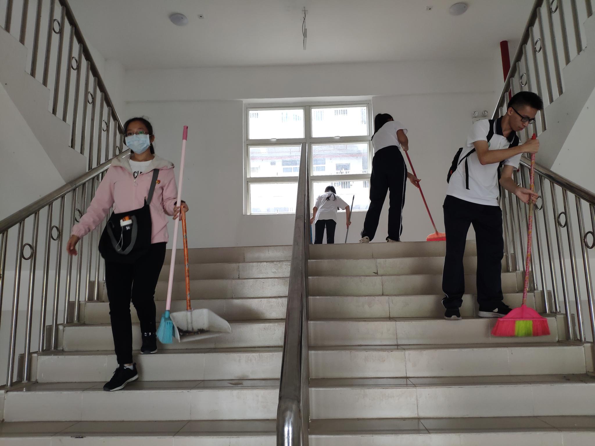 活动开始,学生党支部从物业处领取扫帚、垃圾铲等清洁工具,根据参加活动人数以及需要清理场地分4个小组,同时对一些细节问题进行了详细的说明。从教学楼开始打扫卫生,虽然“汗水与尘土齐飞”,但是同学们脸上都洋溢着快乐的笑容。看着干净的楼梯走道,同学们都从内心感到自豪,深刻体会着奉献精神的伟大。