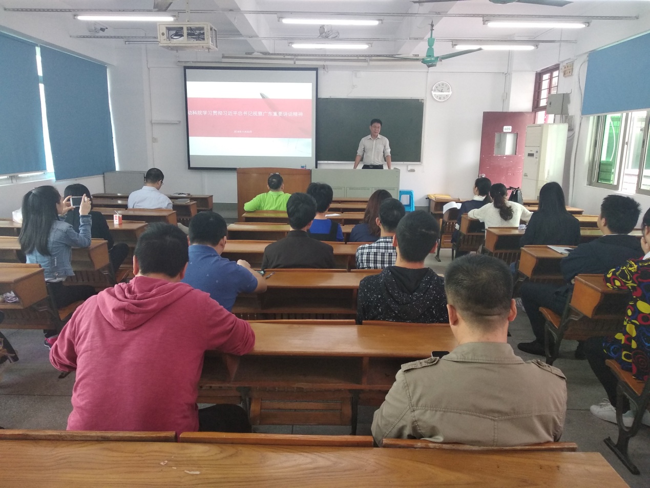 2018年11月30日上午,yl6809永利官网集团党总支书记欧坚泉在海珠校区教学楼605为yl6809永利官网集团全体教工党员做了《动科院学习贯彻习近平总书记视察广东重要讲话精神》的专题讲座。