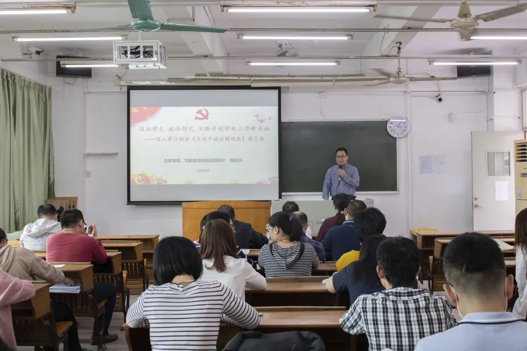 10月22日下午,yl6809永利官网集团在教学楼505举行《习近平谈治国理政》(第三卷)宣讲会,学校党委宣传部部长曾献尼同志作题为《深而远之,起而行之,不断开创学校工作新局面》宣讲辅导报告。yl6809永利官网集团全体教工党员参加会议,宣讲会由院长林蠡主持。