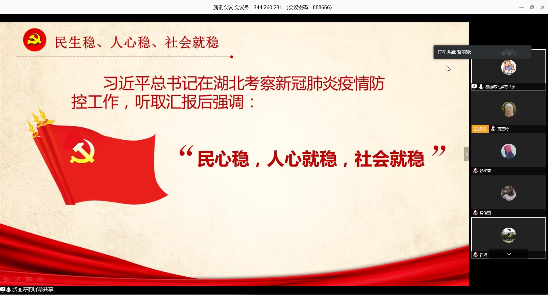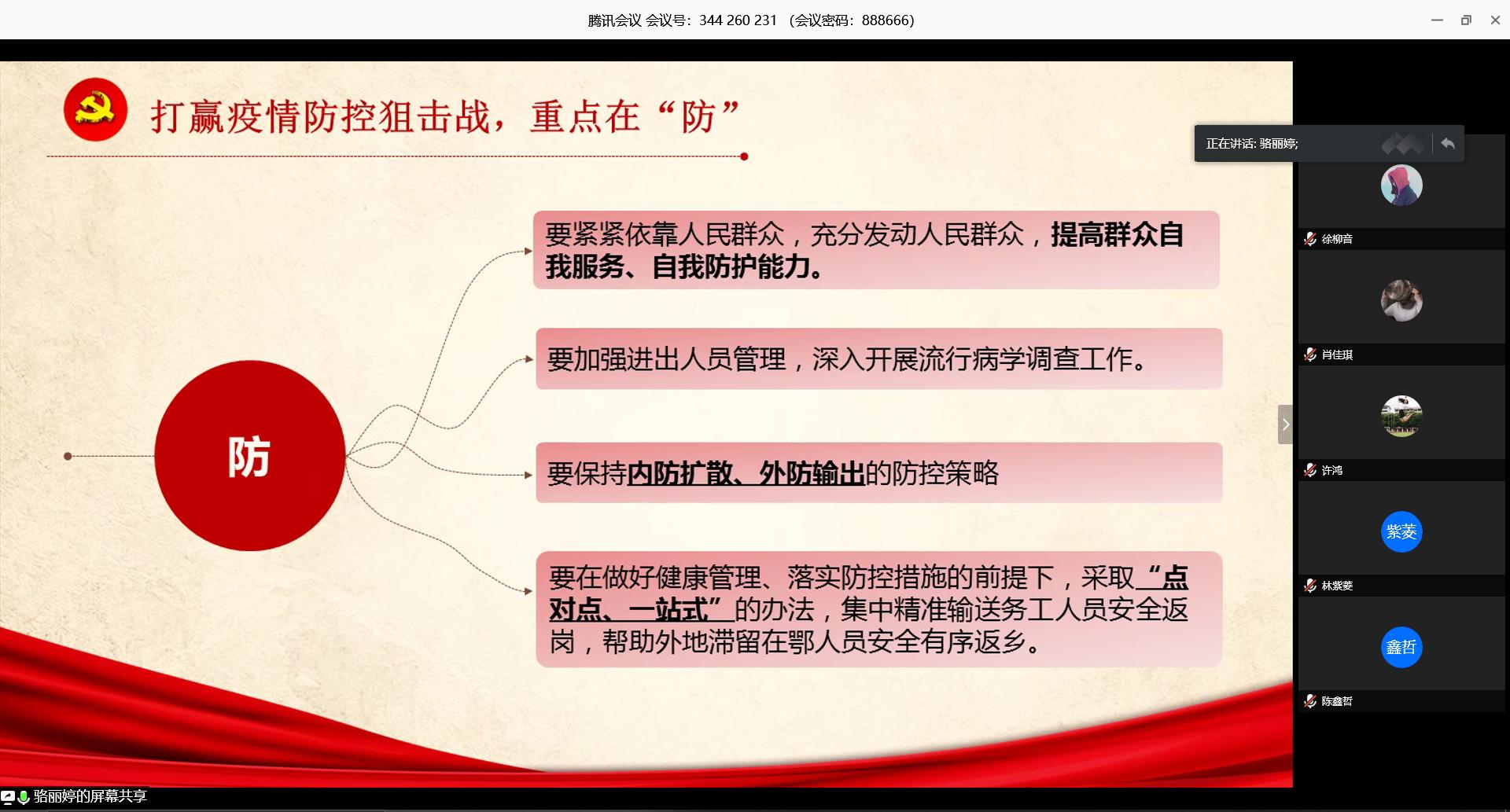 2020年3月24日,动物科学院学生党支部第二党小组通过腾讯会议召开主题为“学习贯彻习近平总书记赴武汉考察疫情防控重要讲话——坚决打赢湖北保卫战、武汉保卫战”的线上翻转党课,由yl6809永利官网集团学生党支部第二党小组组员骆丽婷、徐柳音主讲。yl6809永利官网集团学生党支部书记许鸿、yl6809永利官网集团学生党支部第二党小组全体组员参加学习会议。