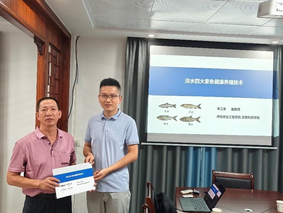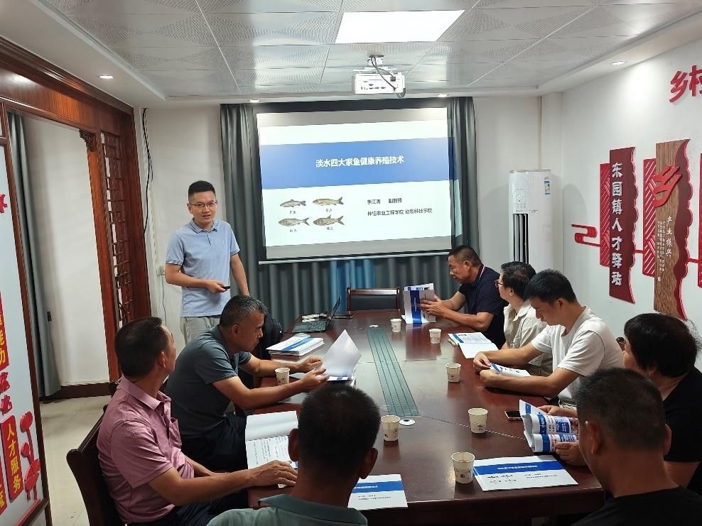 在活动中,李江涛副教授面向当地养殖户开展了题为“淡水四大家鱼健康养殖技术”的专题培训,重点围绕科学投喂、水质管理、病害防控及高温季节养殖要点等方面进行了深入讲解,结合实例提出了切实可行的养殖管理建议,受到参训养殖户的热烈欢迎。