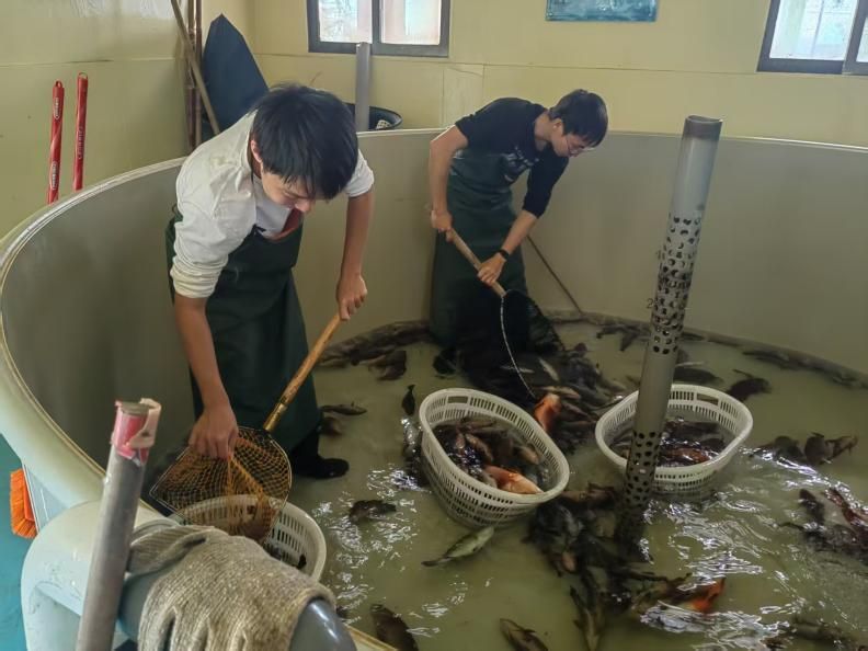 林蠡等深入养殖区域观摩学生实操,同学们身着围裙、手持网具,有条不紊地开展鱼类分拣作业,熟练的操作尽显实习期间的技能提升成效。