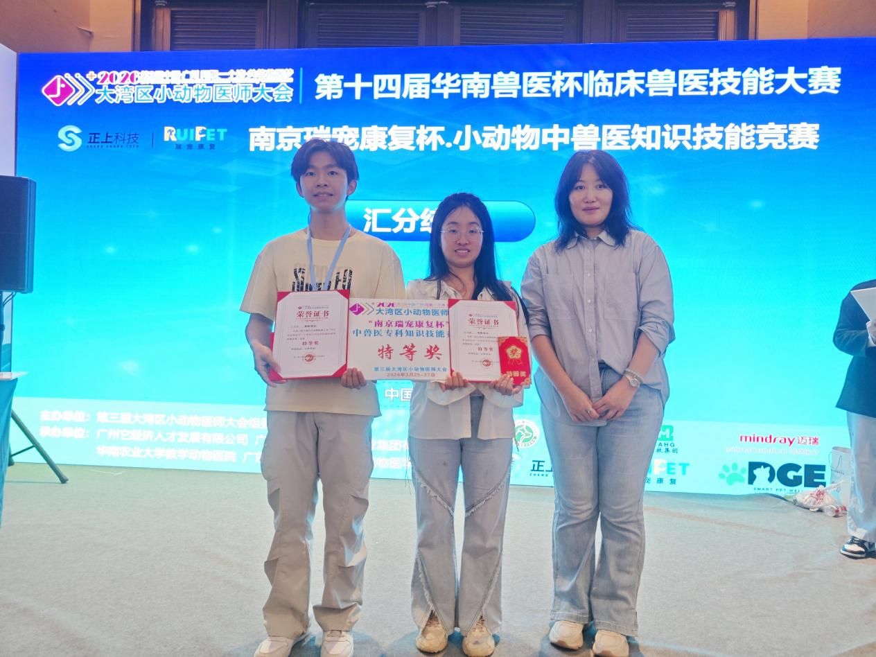 近日,第三届大湾区小动物医师大会小动物技能竞赛暨第十四届华南兽医杯临床兽医技能大赛在广州南沙国际会展中心隆重举行。我院学子凭借扎实的专业功底、出色的临床技能,在牙科知识技能竞赛和中兽医专科知识技能竞赛中表现优异,吴泽辉同学获牙科竞赛一等奖和中兽医竞赛特等奖两项殊荣,易黄玉同学获中兽医竞赛二等奖,尽显仲恺学子专业风采。