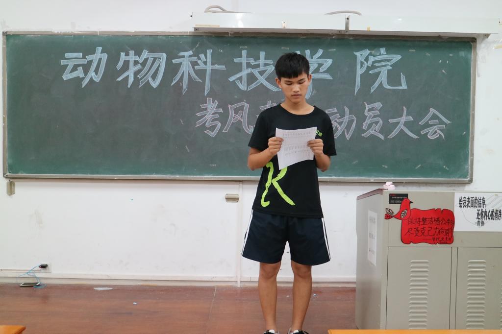 动科2015级学生包海缘代表全体学生宣读了《诚信考试承诺宣言》。在曾献尼和沈洁的见证下,各班级代表签订了《诚信考试承诺书》。