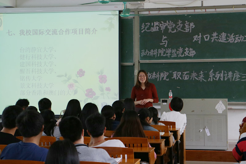 姚老师从大学生职业生涯规划的角度出发,提出一个新的发展视角:即赴境外开展交换或交流学习,从而开拓眼界、增长阅历,培养独立能力、锻炼外语水平。姚老师还重点为同学们介绍了与我校建立合作的英国、美国、新西兰等国优秀大学的项目。外国语学院13级学生杨阳作为已参与过对外项目的学生,也来到现场与动科院学生们交流经验。